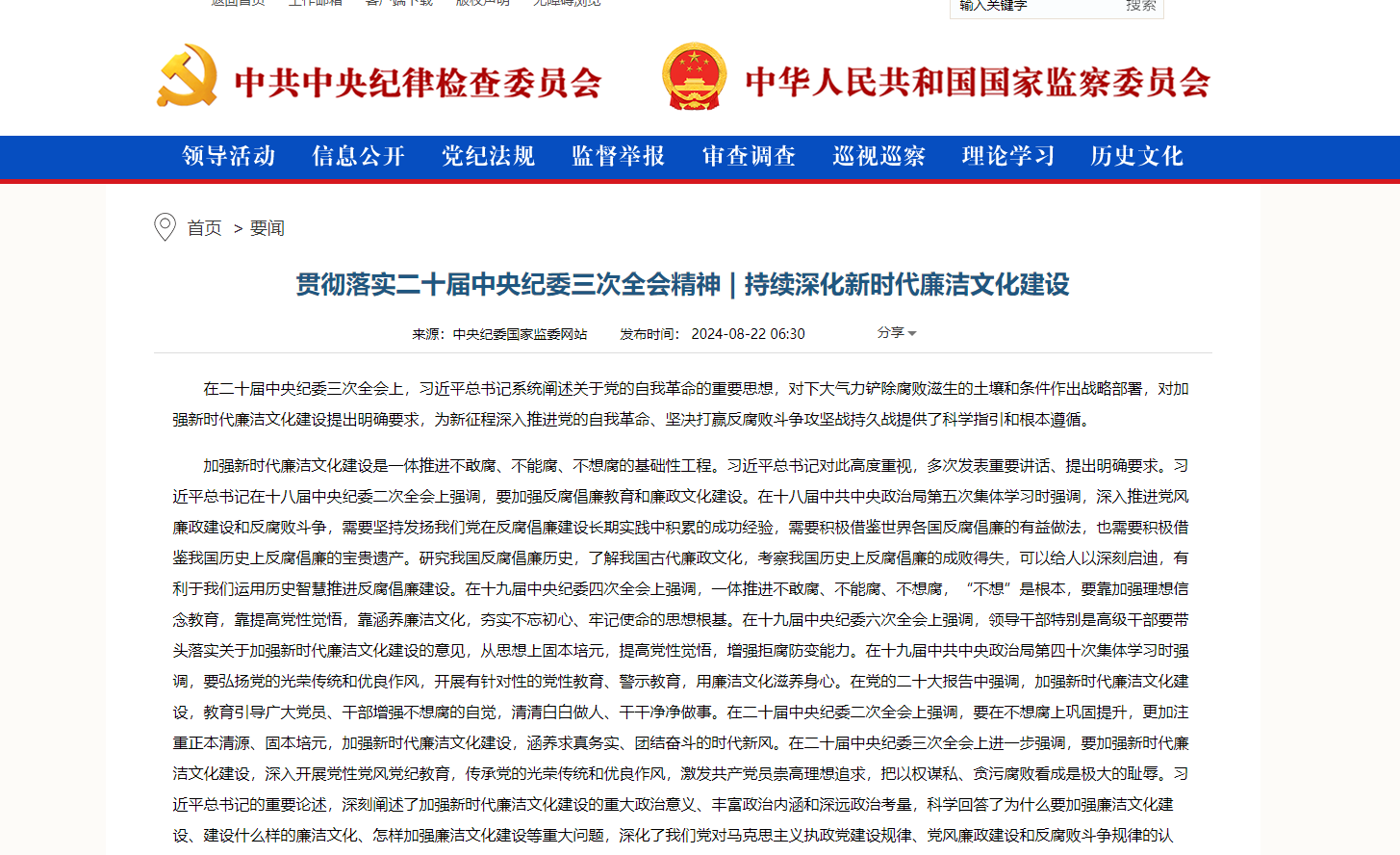 在二十届中央纪委三次全会上,习近平总书记系统阐述关于党的自我革命的重要思想,对下大气力铲除腐败滋生的土壤和条件作出战略部署,对加强新时代廉洁文化建设提出明确要求2024-08-28